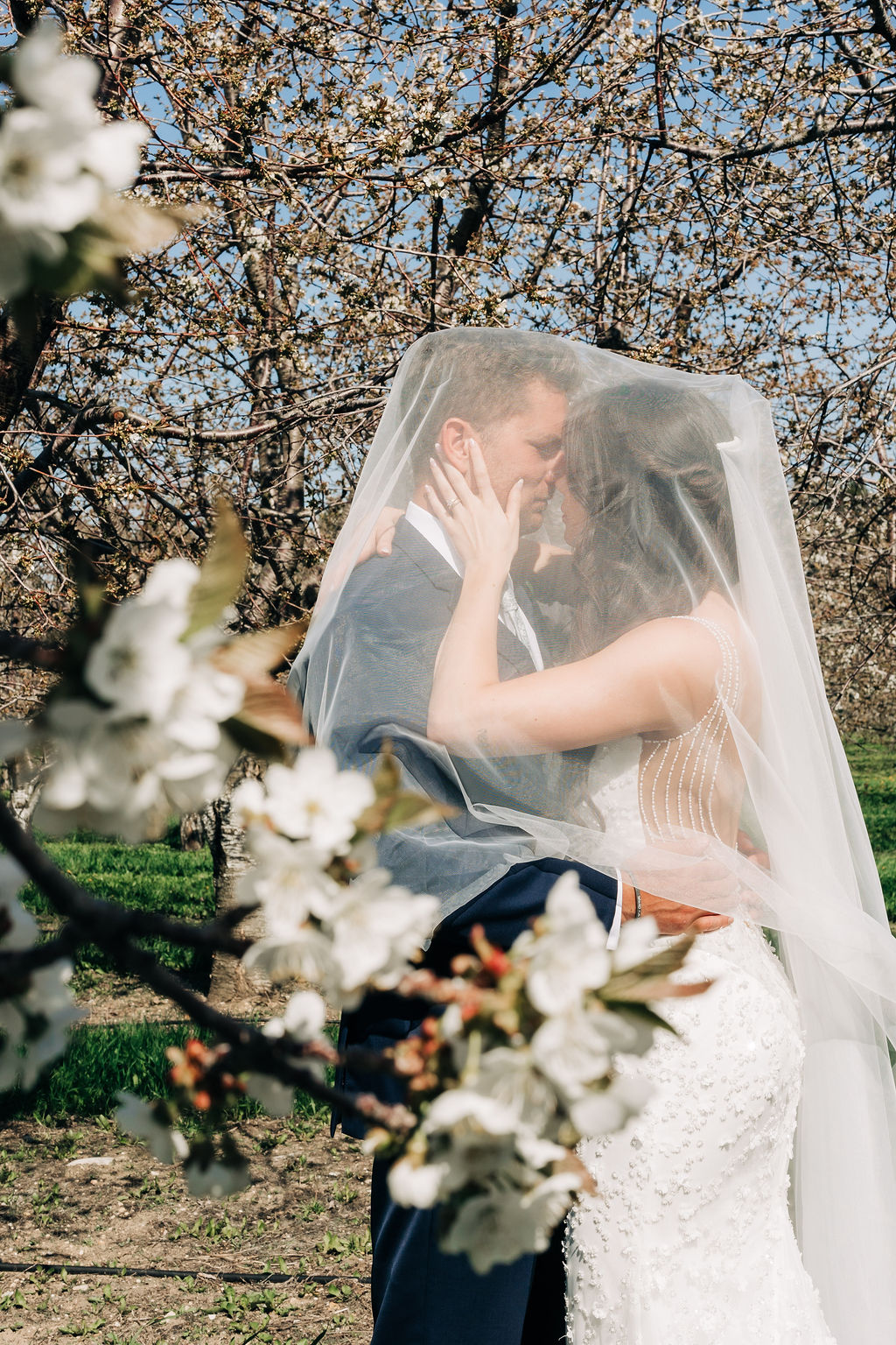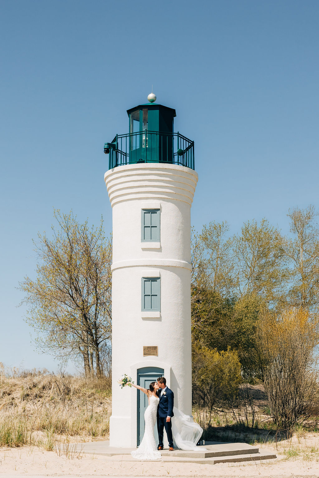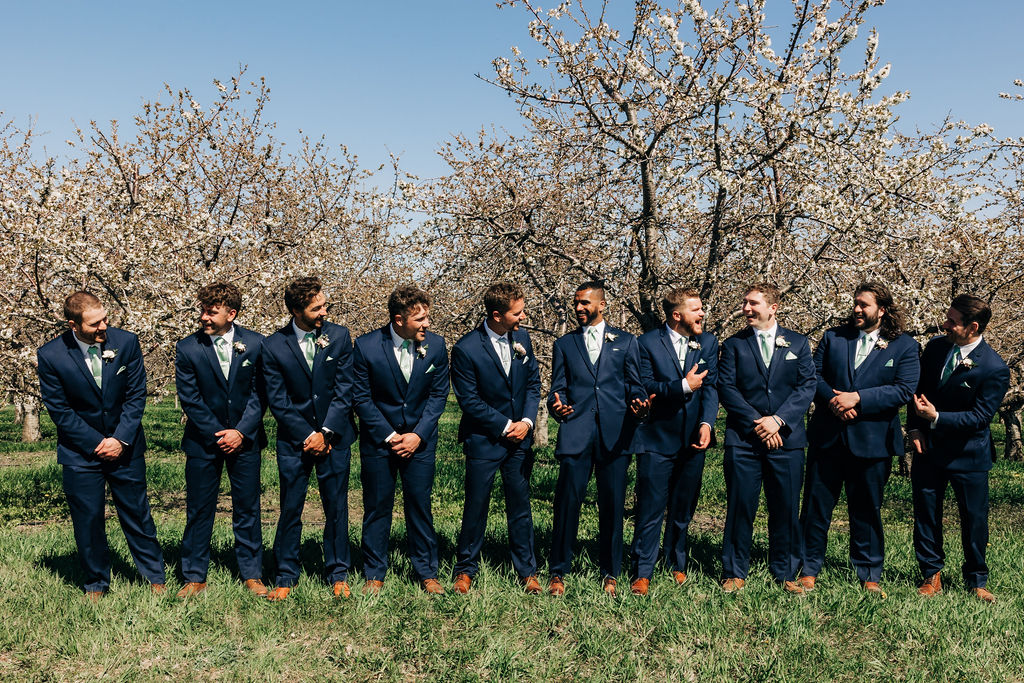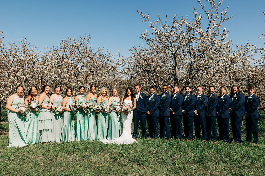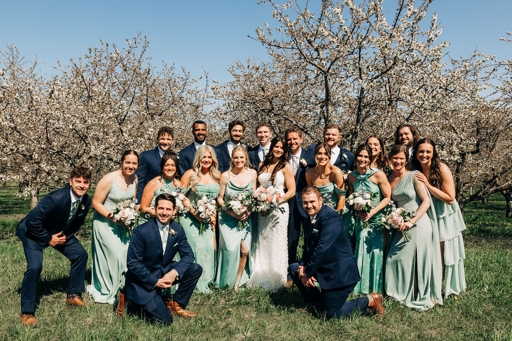 Back to their wedding day – we headed to Empire Beach for portraits post-ceremony to capture the breezy, beachy Northern Michigan vibe with big smiles. Later, I grabbed some more portraits amid the cherry blossoms near Rove at a private residence that we were granted use of, plus some fun shots of the bridal party.
