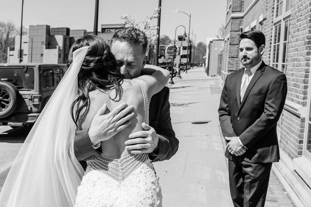 Before heading to the church, we stole a quick moment for a first look with her Dad and brother outside the salon, and it was super sweet.